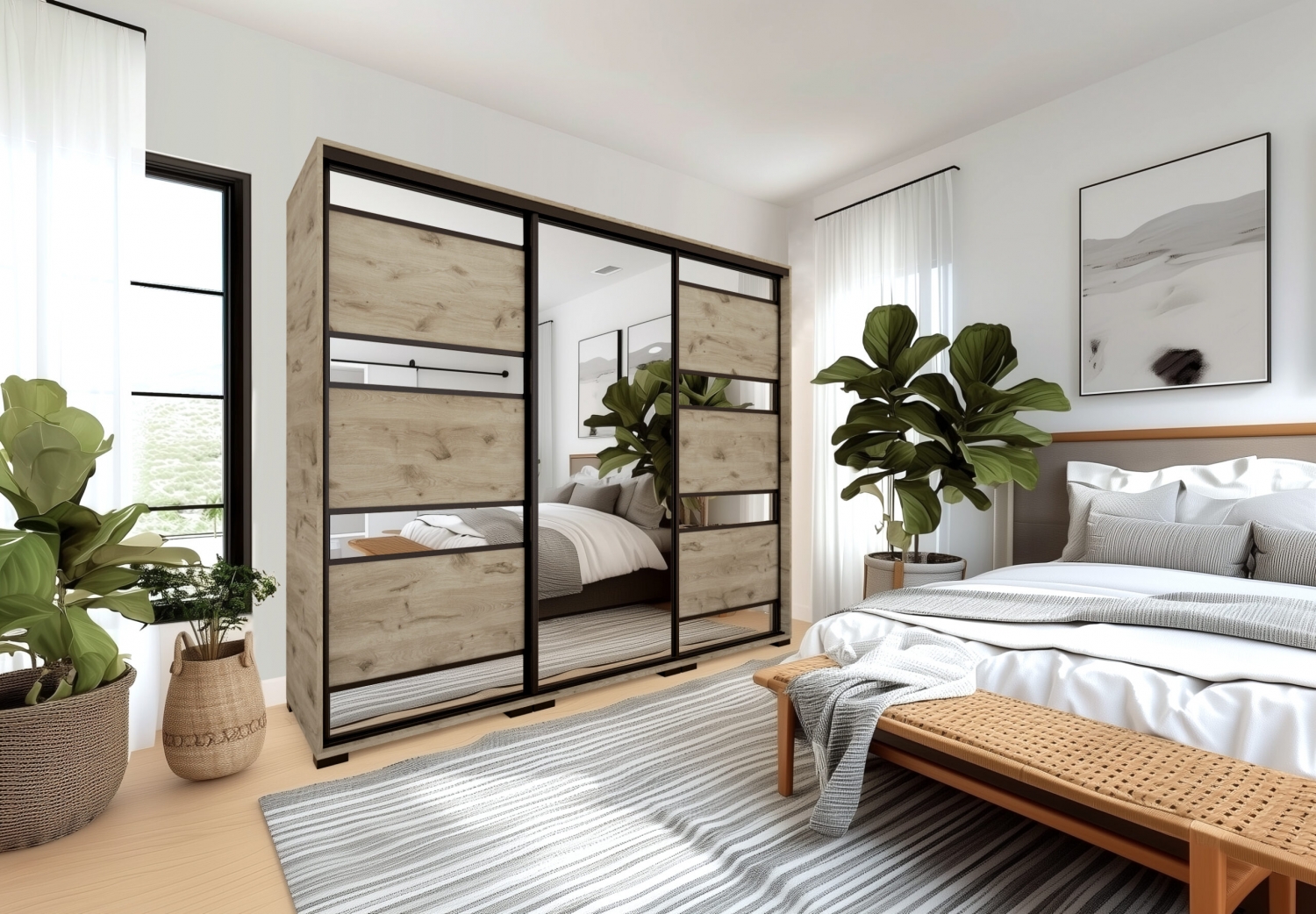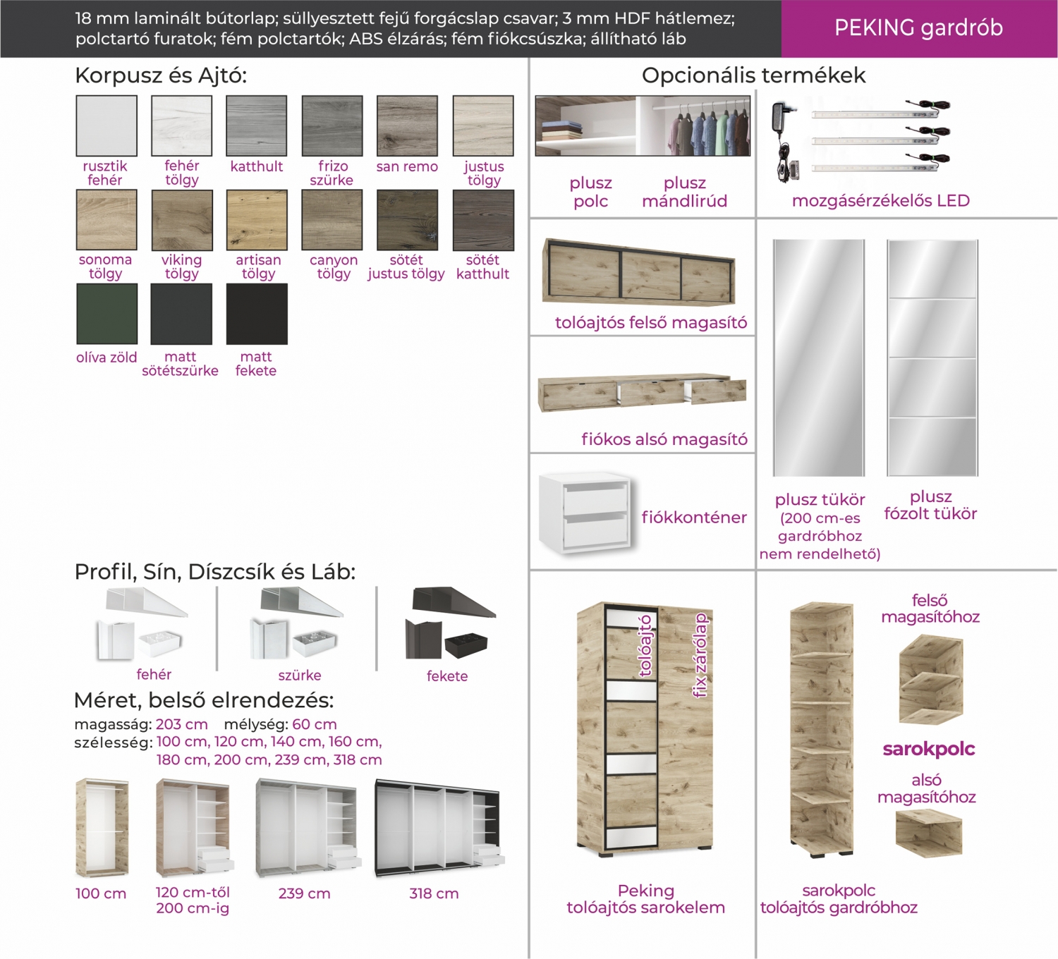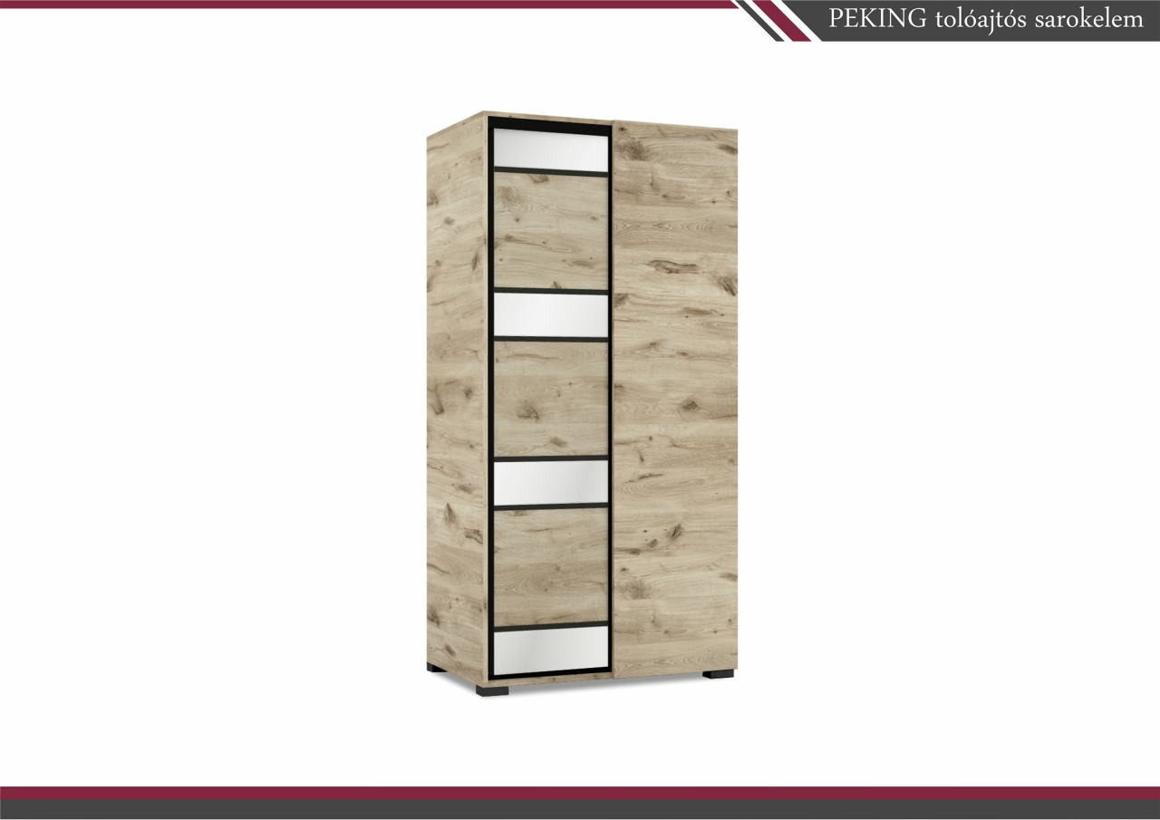 A Peking gardrób elegáns tükör betéttel készül, 8 méretben. A tükrös ajtók hatására a szoba tágasabbnak, világosabbnak tűnik. Belső elrendezését tekintve teljesen személyre szabható, köszönhetően az akár egymásra is helyezhető fiókdobozoknak, polcoknak, mándlirudaknak.