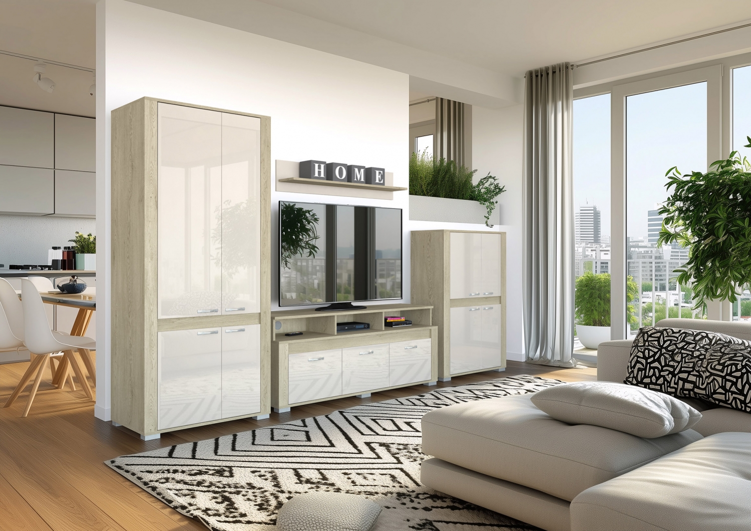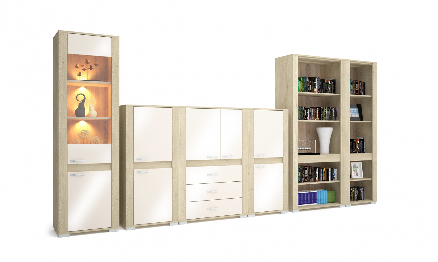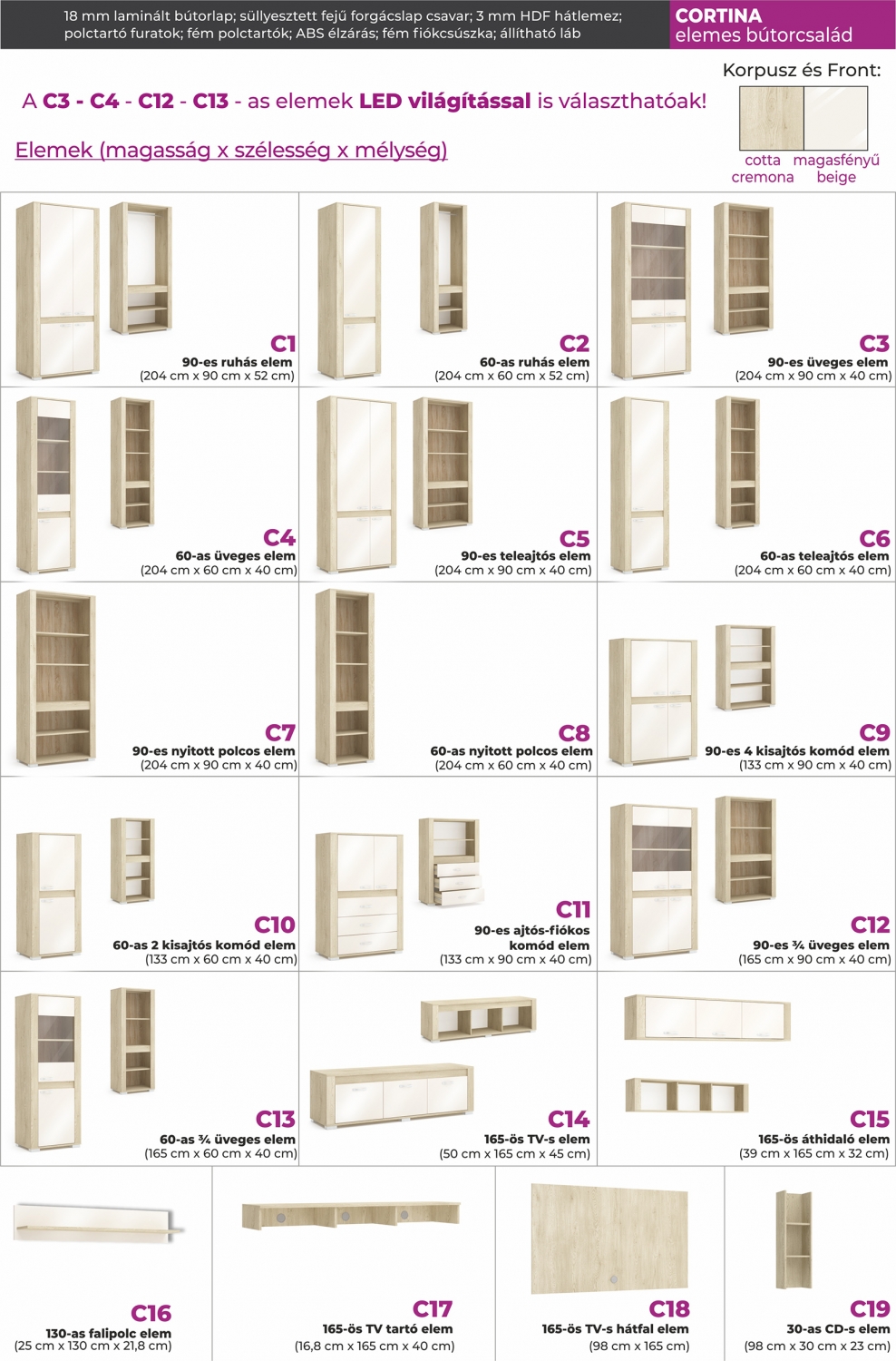 Termékleírás:- 18 mm vastag forgácslap - Nem lapra szerelt (késztermék), így nem igényel plusz költséget az összeszerelés - Köldökcsapos ragasztott technológiával összeállítva (nem forgácslap csavarral) - ABS élzárás - 3 mm HDF hátfal lemez - Fém csapágygörgős fiókcsúszó - Fém polctartókMagasság: 195 cm Szélesség: 400 cm Mélység: 50 cm Meleg színvilágú, dekoratív megjelenésű ez a nagy méretű szekrénysor, ami tartalmaz mindent, amire csak szükség lehet. Polcos, vállfás, és vitrines elemek biztosítják, hogy tényleg mindennek legyen helye. Nagyszerű választás lakó és munkatérbe egyaránt.