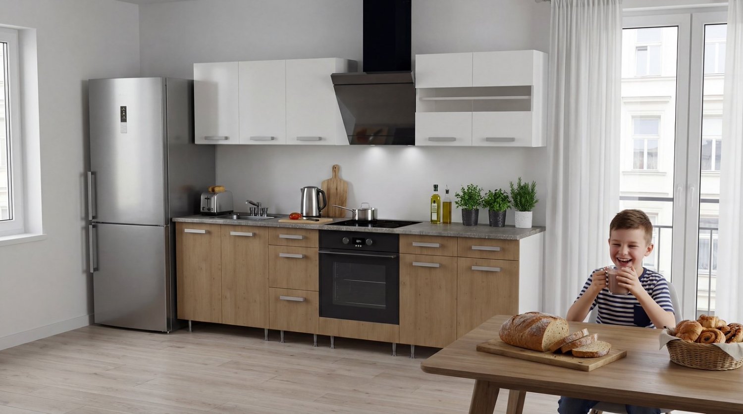 Nem lapraszerelt! Elemes 200 cm konyhabútor 60cm és 72 cm magas felső elemekkel. 1 medencés + csepegtetős mosogatóval Blokk konyháink és a hozzájuk tartozó kiegészítő elemek árai minden esetben tartalmazzák a használathoz szükséges alapfelszereltséget, így vásárlóink egy komplett, azonnal beépíthető megoldást kapnak. A feltüntetett ár magában foglalja: a 28 mm vastagságú munkalapot, a mosogató elemek esetében a mosogatótálcát és a hozzá tartozó szifon csomagot (blokkkonyháknál is), a műanyag fogantyúkat, valamint a műanyag bútorlábakat. Fontos tudnivaló, hogy ezeknél a konyháknál nincs lehetőség fém lábak, fém fogantyúk, illetve szokli vagy egyéb lábtakaró elemek választására. A konyhabútorok minden esetben gyárilag összeszerelt állapotban kerülnek átadásra. Az elemek stabilitását tiplizett és ragasztott kötés biztosítja, így azok tartós és megbízható használatot nyújtanak. A csomag részét képezik: a bútorlábak és fogantyúk (ezeket a helyszínen, utólag szükséges felcsavarozni), a felszereléshez szükséges dübelek és csavarok, valamint a korpusz elemek összehúzásához szükséges korpusz-összehúzó csavarok. Ennek köszönhetően a telepítéshez minden alapvető szerelési tartozék rendelkezésre áll.1,6 cm vastag laminált bútorlap-ABS élzárás-görgős fiókcsúszók-állítható polcok fém polc tartókkal-3 dimenzióban állítható belső felfüggesztés- 3 mm vastag fehér HDF hátlemez-teletetős 1 medencés (csepegtetővel) vagy 2 medencés mosogató tálca- front laminált forgácslap fehér üvegbetéttel-műanyag fogók szürke színben-10 cm magas állítható láb szürke színbenMunkalap-28 mm vastag munkapult HPL bevonatal-elemenként külön felszerelve.szélesség: 200 cm alsó elemek magassága: 85 cm felső elemek magassága: 60 cm lábon álló kivitel – könnyebb tisztán tarthatóság nem lapraszerelt – elemenként, gyárilag összeszerelve érkezik a fogantyúk és lábak szállítás miatt nincsenek felszerelve a fogantyúk helye belülről elő van fúrva a mosogatótálcán nincs kifúrva a csap helye – így tetszés szerint alakítható.A konyhablokk standard méretű elemekkel bővíthető! 1 év garancia