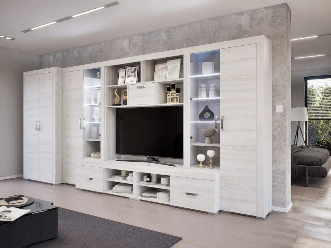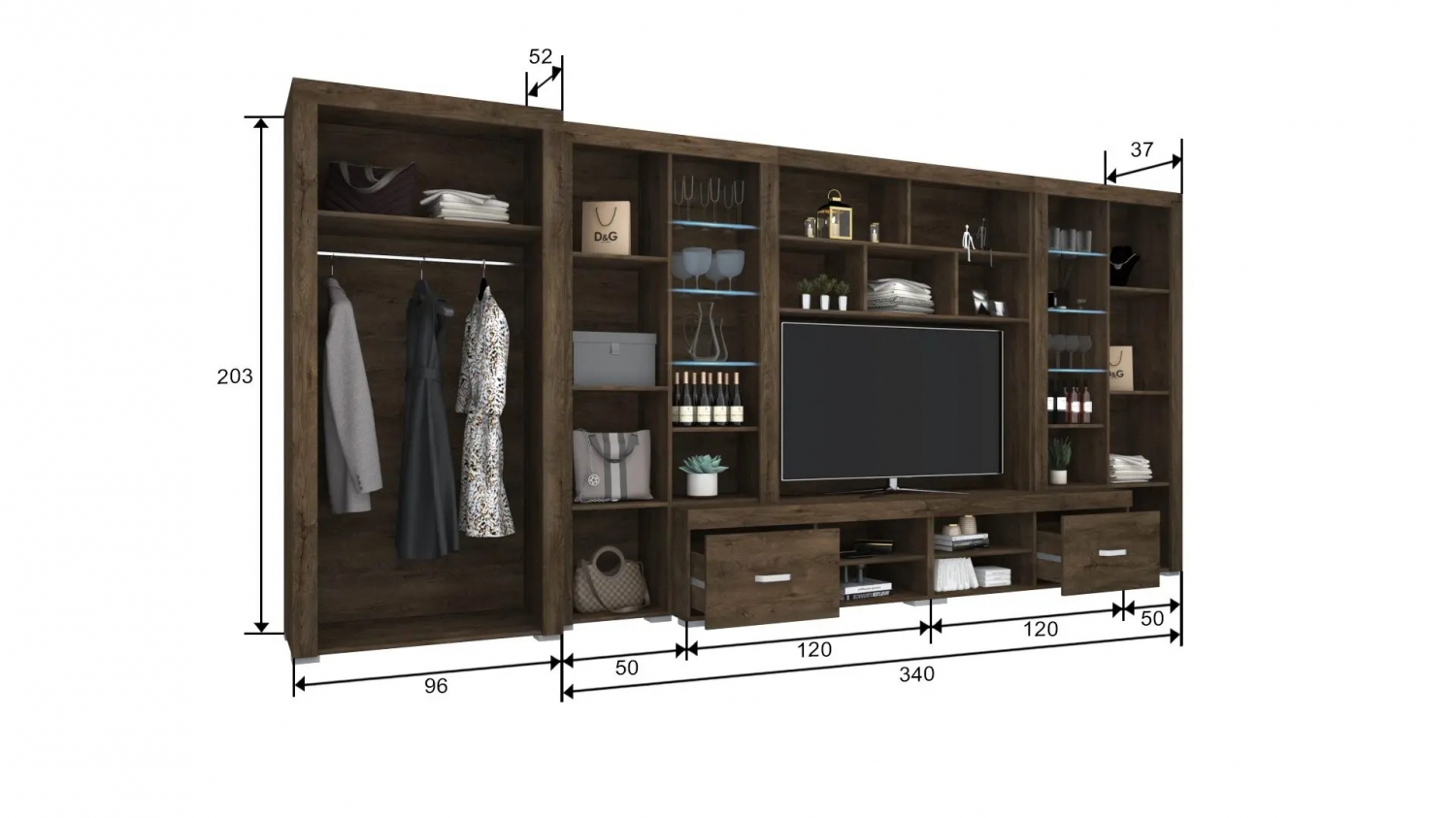AZ ALÍZ SZEKRÉNYSORUNK MODERN KIVITELŰ, AJTÓS, FIÓKOS, ÜVEGES ELEMMEL KOMBINÁLVA. A TERMÉK 18MM-ES LAMINÁLT FORGÁCSLAPBÓL KÉSZÜL, ABS ÉLZÁRÁSSAL ZÁRVA. A Tv s rész helye 140 cm széles Ruhás elem rendelhető hozzá!Modern kivitelű szekrénysor. Megtalálhatóak benne a polcos, fiókos, akasztós részek. A vitrines elemek LED világításos üvegpolcokkal rendelkeznek. A termék 18 mm-es laminált forgácslapból készül, a lapok ABS élzárással ellátva. Elemenként is rendelhető.A termék elemenként készre szerelve kerül kiszállításra.A képek illusztrációk. Több színben rendelhető a termék.Méret:346 x 203 x 52/37 cm346 + 96 cm (ruhás elemmel)AJÁNDÉK LED VILÁGÍTÁSSAL!