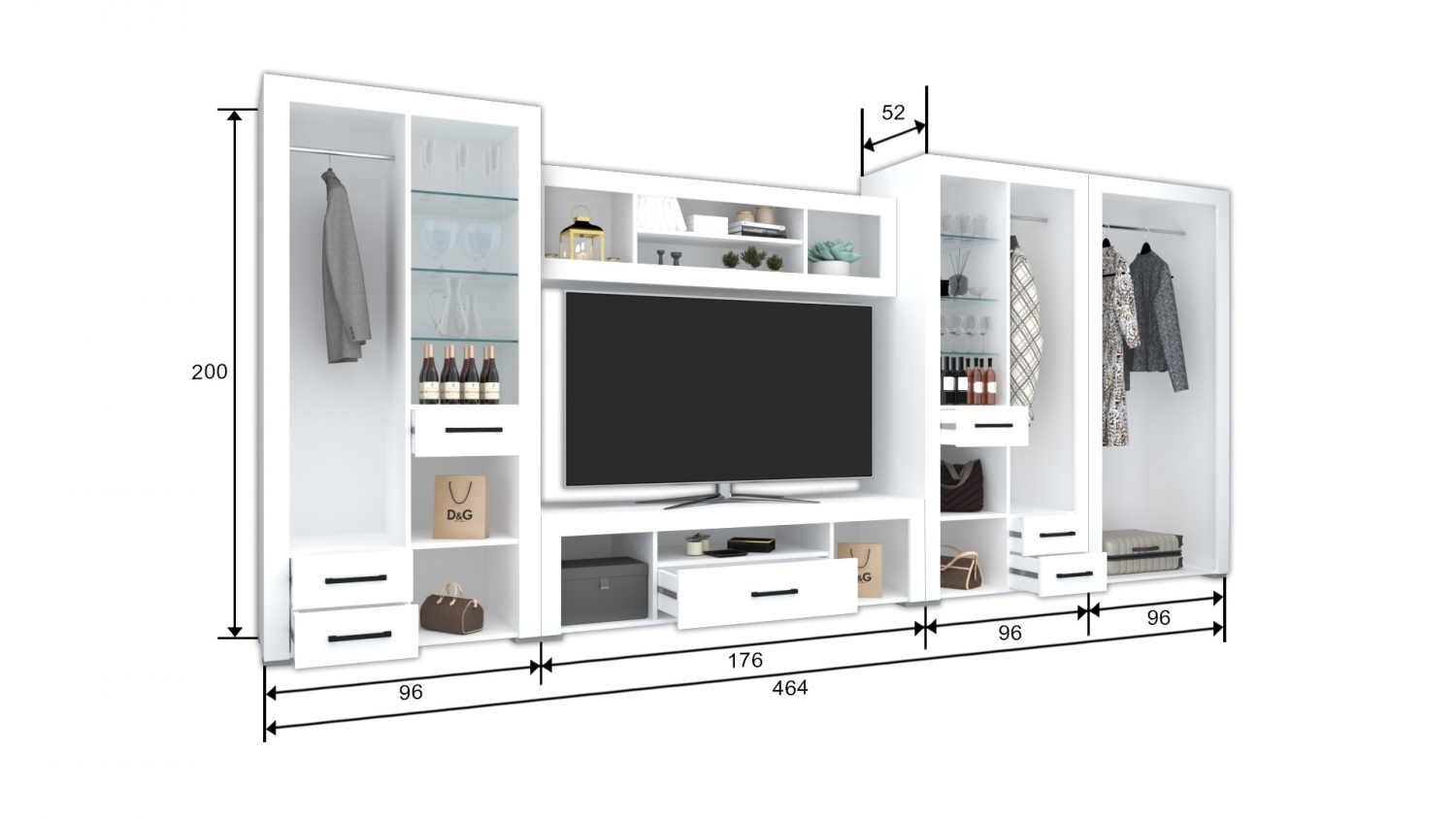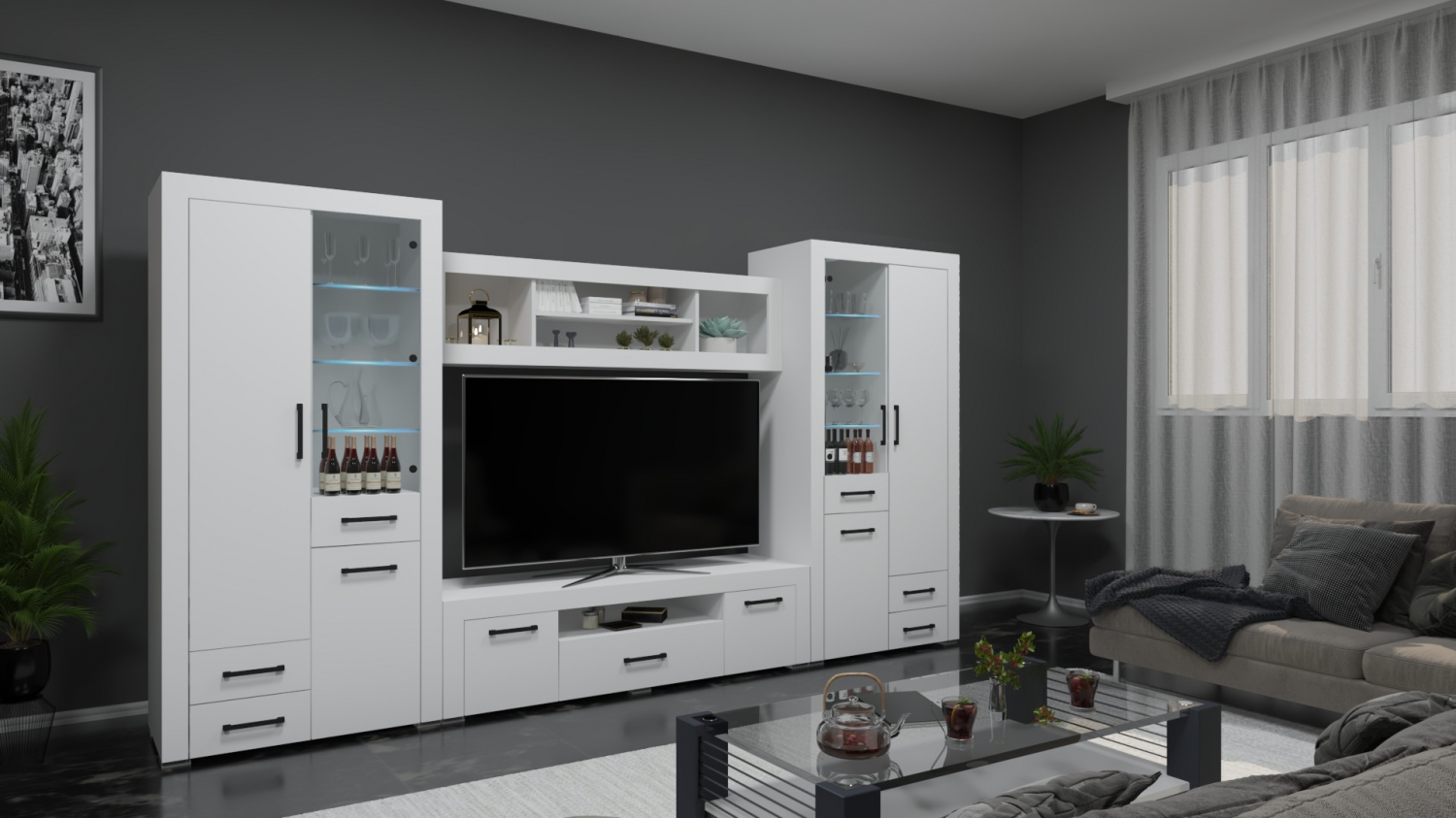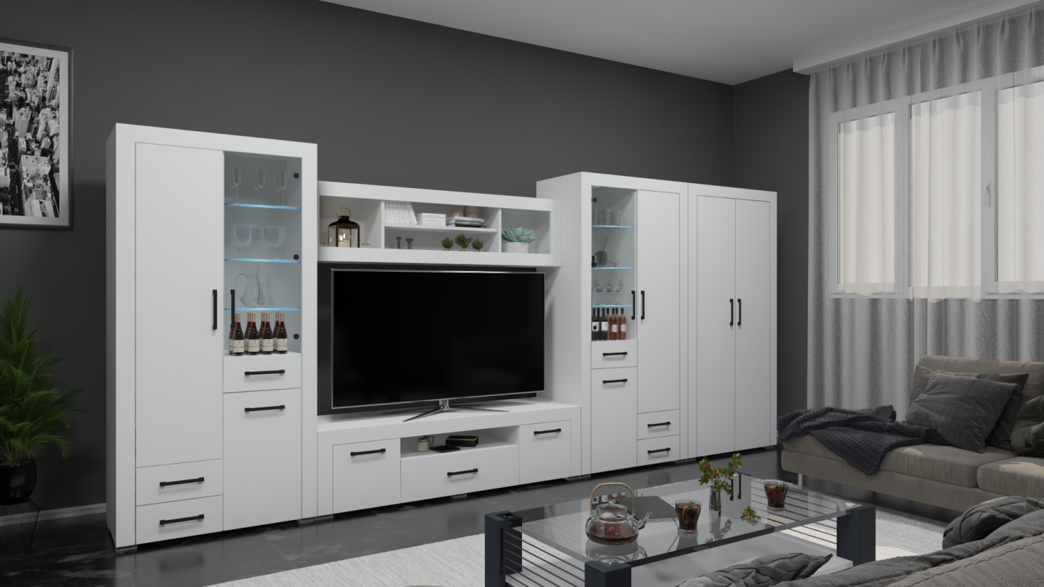 Modern kivitelű szekrénysor. A vitrines elemek LED világítással üvegpolcokkal rendelkeznek. Modern fekete fém fogantyúkkal ellátva. A termék 18 mm-es laminált forgácslapból készül, a lapok ABS élzárással ellátva.Méret: 368 cm széles x 200 cm magas x 52/37 cm mély ( 2 ajtós ruhás elem nélkül ! )A szekrénysorhoz 2 ajtós ruhás elem is rendelhető ( 1 polccal, és akasztórúddal ellátva): +89.000 FtRuhás elem mérete: 96 cm széles x 200 cm magas x 52 cm mélySzállítási idő : kb. 3-6 hét, ( raktárkészleten lévő termék esetén 1-2 hét )A termék készre szerelt. Több elemből álló bútor elemenként készre szerelten kerül kiszállításra.A biztonságos szállítás érdekében a fogók külön egységcsomagban vannak elhelyezve, melyet Önnek utólag kell felszerelni. A termékek fotói, valamint a méretek a gyártó által kiadott katalógusból származnak. A színeltérésért, és nyomdai hibákért felelősséget nem vállalunk.Jótállási, valamint garanciális feltételekről részletes tájékoztatást az ÁSZF ( Általános Szerződési Feltételek) menüpont alatt talál. Ha esetlegesen nem biztos egy termék színében, akkor munkatársaink készséggel segítenek Önnek.A fotókon lévő díszítőelemeket az ár nem tartalmazza. AJÁNDÉK LED VILÁGÍTÁSSAL!